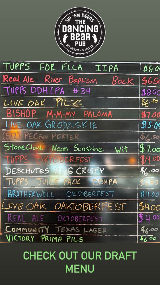 Located in Waco, Texas, The Dancing Bear Pub is a cozy and inviting spot known for its friendly owner, Kevin, and welcoming vibe. Customers rave about the great beer selection, happy hour deals, and dog-friendly atmosphere, thanks to Kevin's adorable dog. The knowledgeable bartenders offer a vast selection of beers on tap, including flights for sampling. With TV screens tuned to out-of-market games and plenty of giveaways, this pub is a go-to spot for beer enthusiasts. The staff's super-friendly demeanor and diverse beer selection make it a top choice in Waco. Whether you're stopping by for a classic Thursday night or gathering with friends on a Tuesday, Friday, or Saturday, The Dancing Bear Pub offers a laid-back atmosphere and a chance to enjoy quality brews.